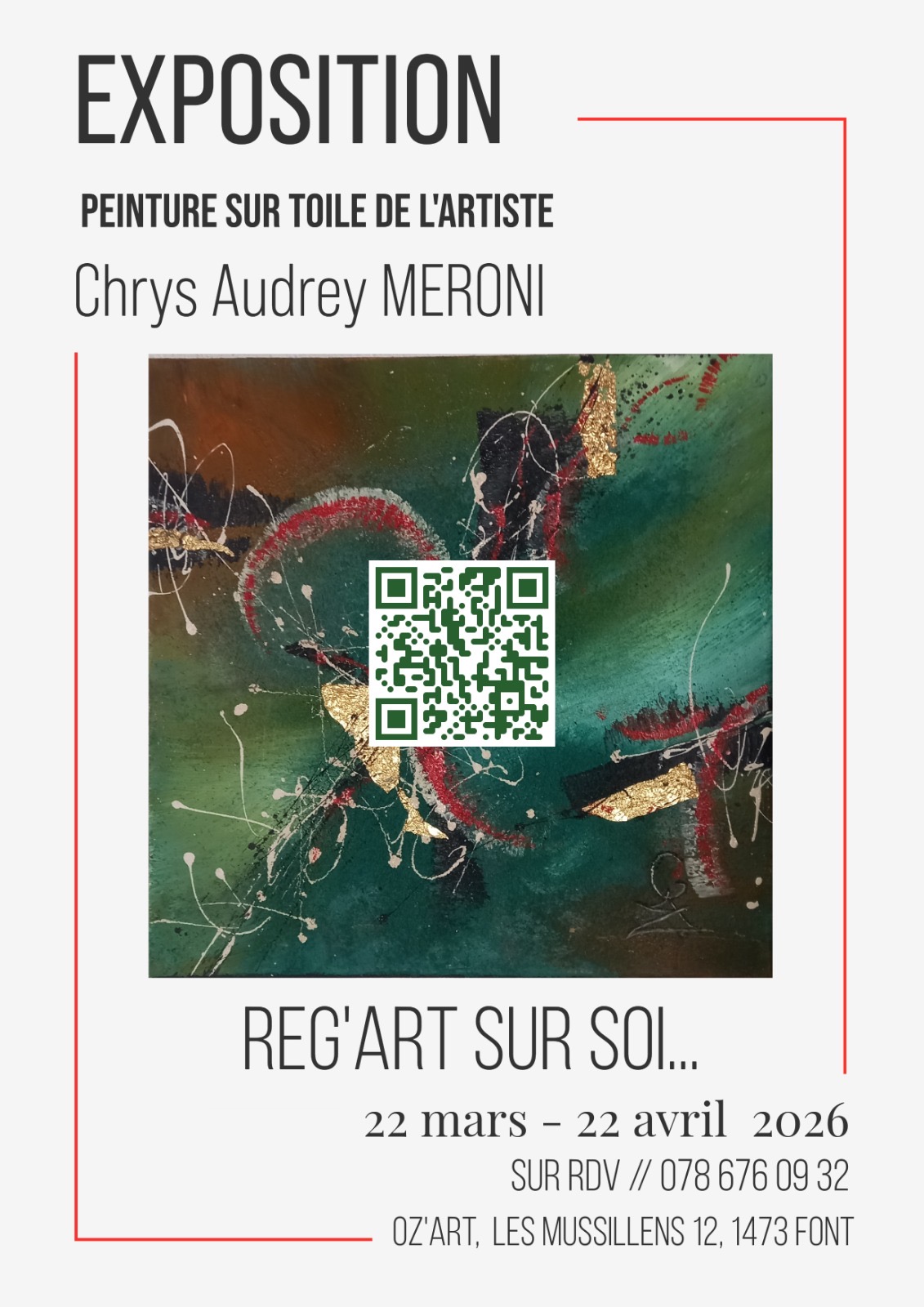 Chrys Audrey Meroni est une artiste dont le cœur oscille entre poésie et lucidité. Son univers intérieur, vaste et en constante évolution, est éclairé de couleurs vibrantes, de silences évocateurs et d’intuitions profondes. Elle écoute le monde avec une sensibilité aiguisée, captant les émotions qui l’entourent comme un écho avant même de les exprimer à travers sa créativité.