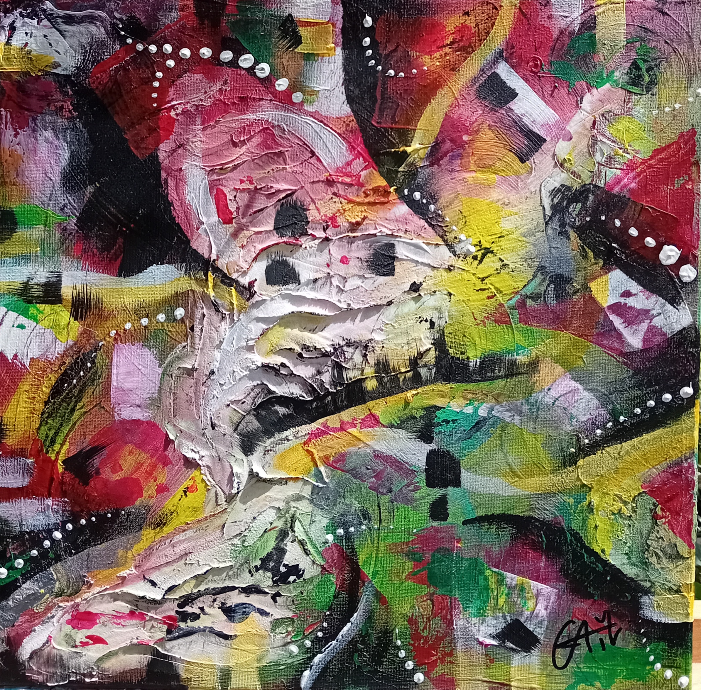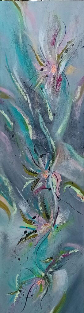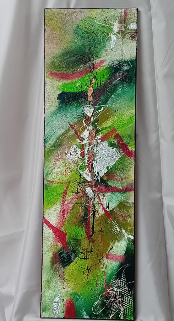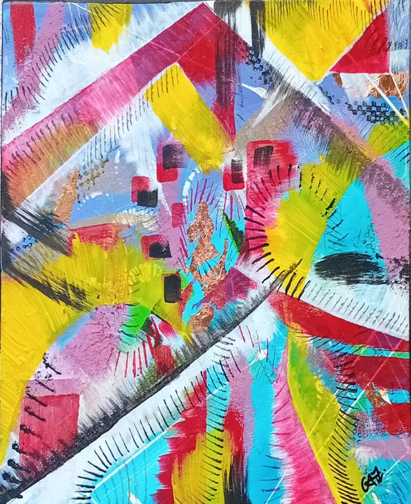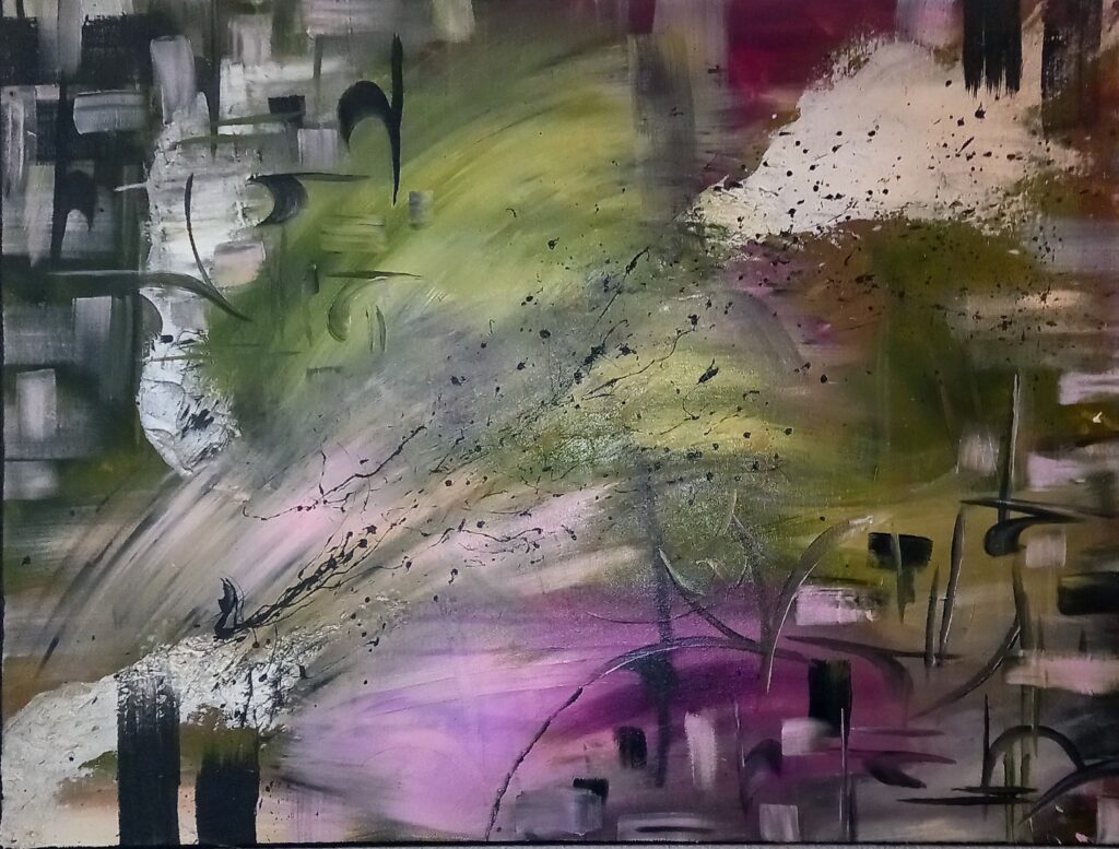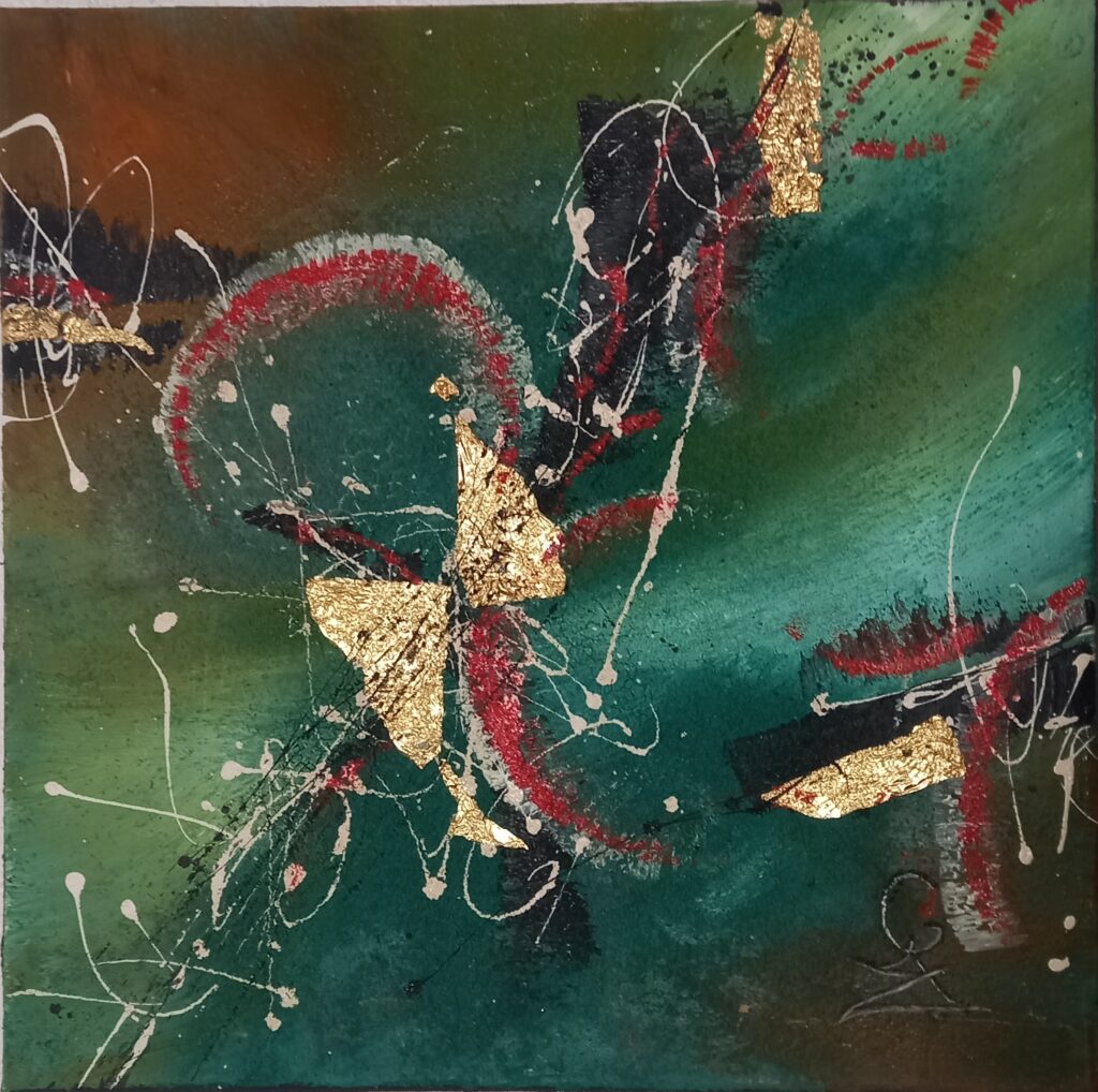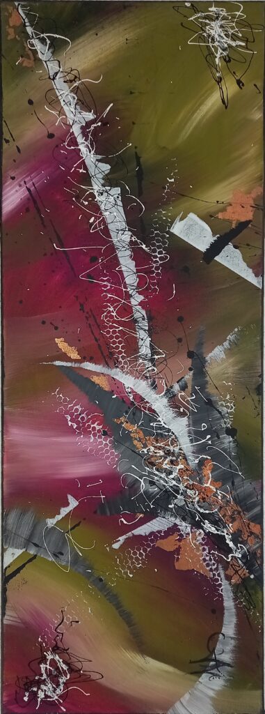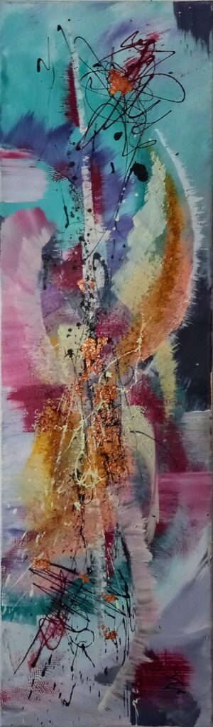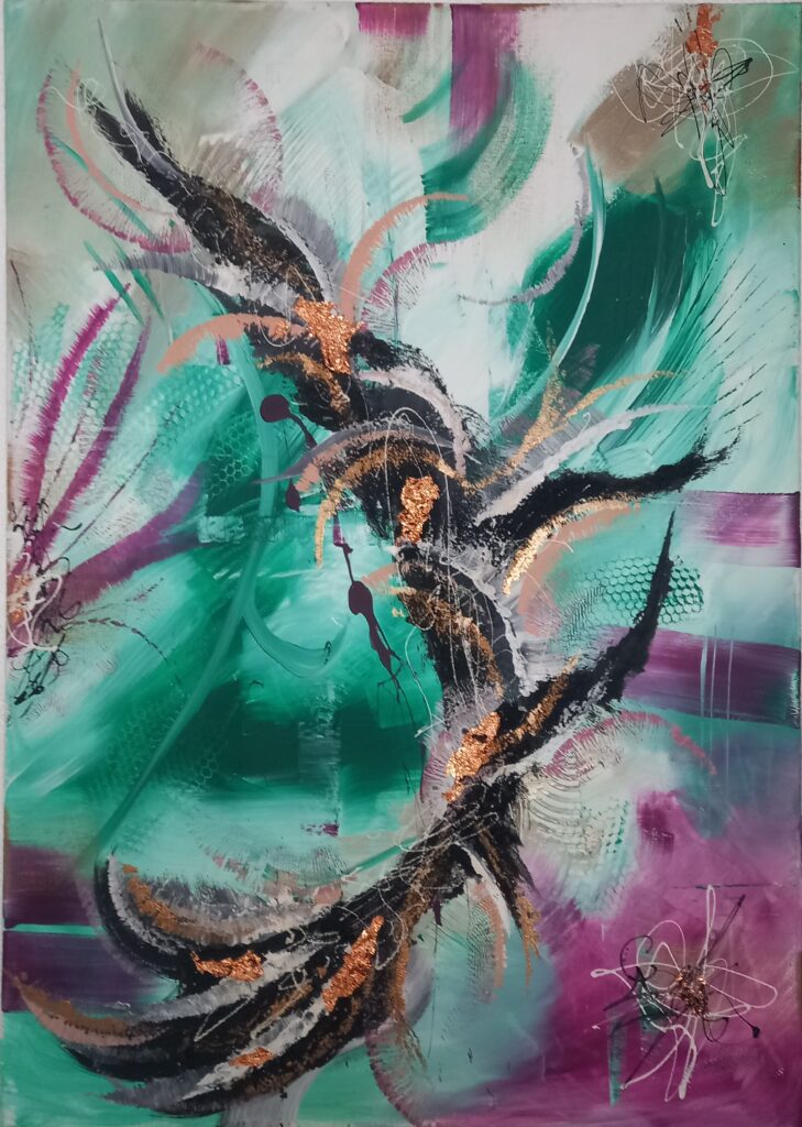 Son art reflète cette immersion dans la réalité : chaque tableau devient une œuvre vivante, où textures et formes s’entrelacent avec des émotions cachées et des joies vécues, tout en laissant place à l’inconnu. Les couleurs, souvent audacieuses, se mêlent à des nuances plus subtiles, créant un langage visuel qui dépasse les mots. Elle explore des thèmes touchant à l’âme humaine, gardant confiance dans la profondeur des expériences vécues par chacun.